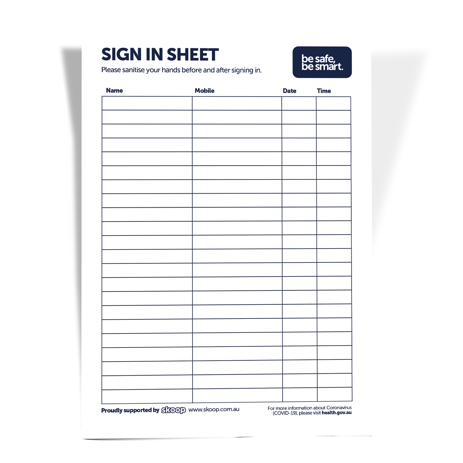 Don't forget to have hand sanitiser nearby for use before and after signing in. We've created a little reminder sign for that too—check out our poster pack.